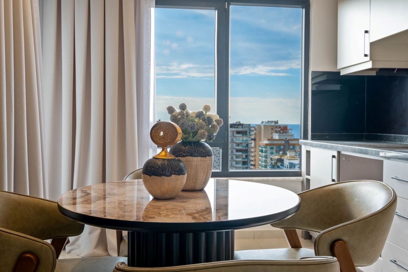 Die Immobilie wird voll möbliert mit luxuriösen Möbeln verkauft und ist sofort bezugsfertig. Ein großzügiges Wohnzimmer mit moderner offener Küche, zwei Badezimmer sowie zwei Balkone bieten viel Komfort und Lebensqualität. Von den Balkonen aus genießen Sie einen wunderschönen Blick auf das Mittelmeer.