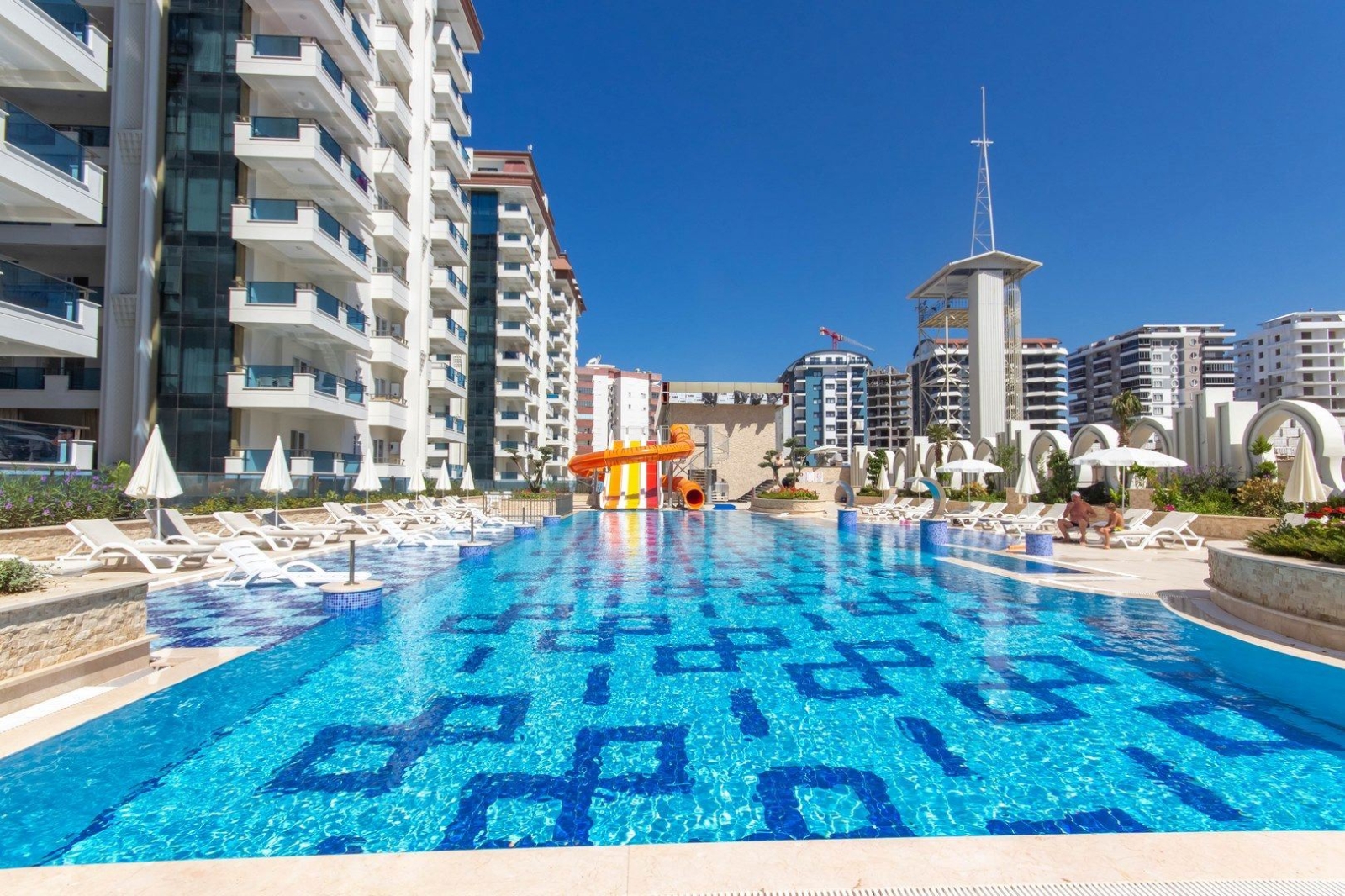 Large outdoor pool with slides and sun loungers