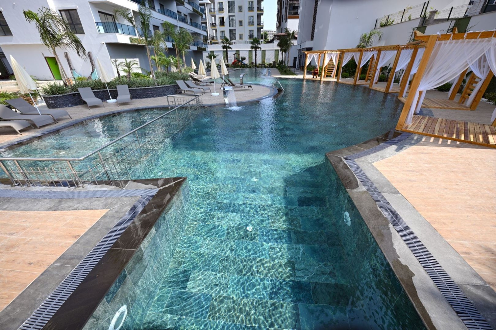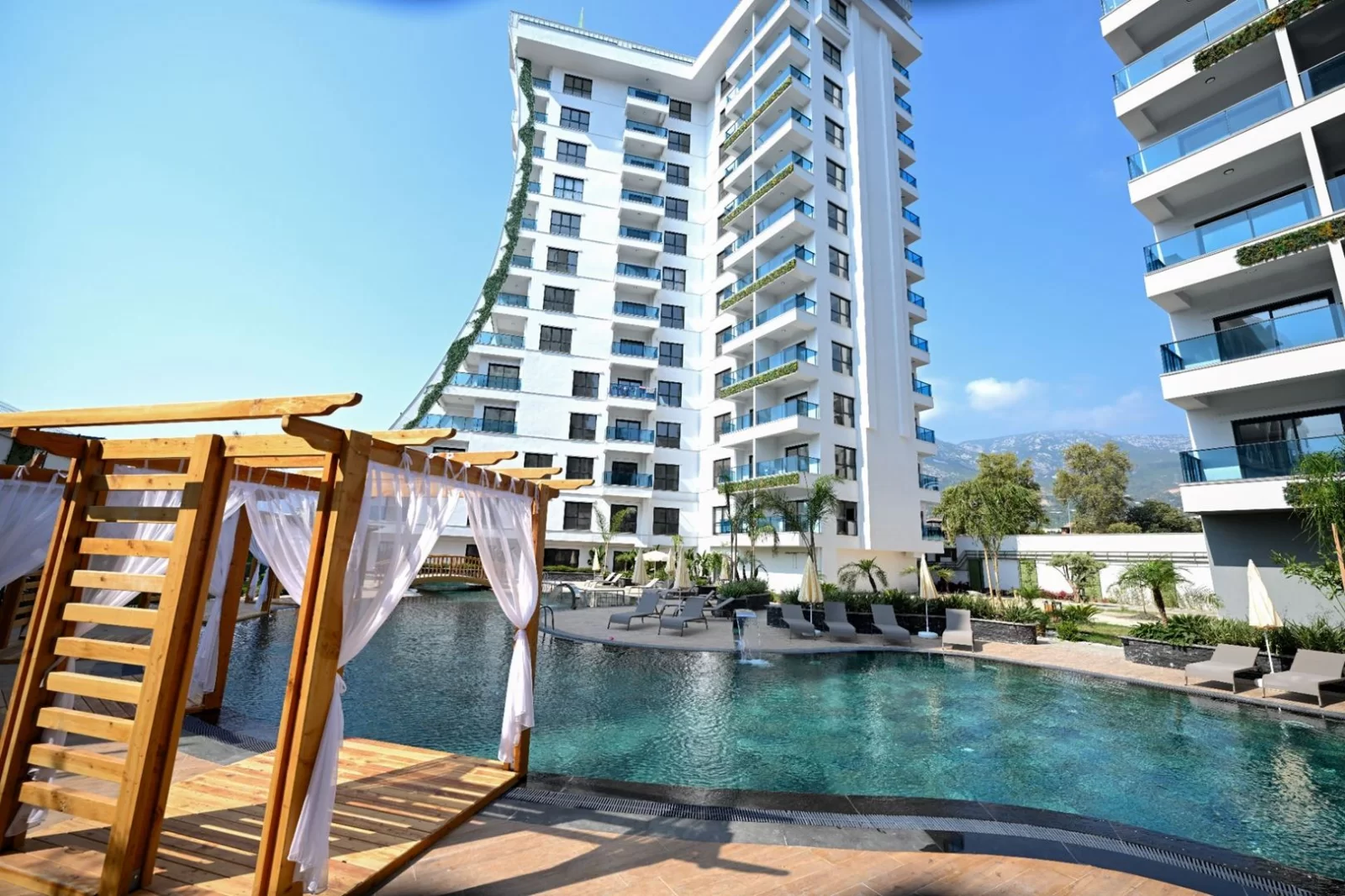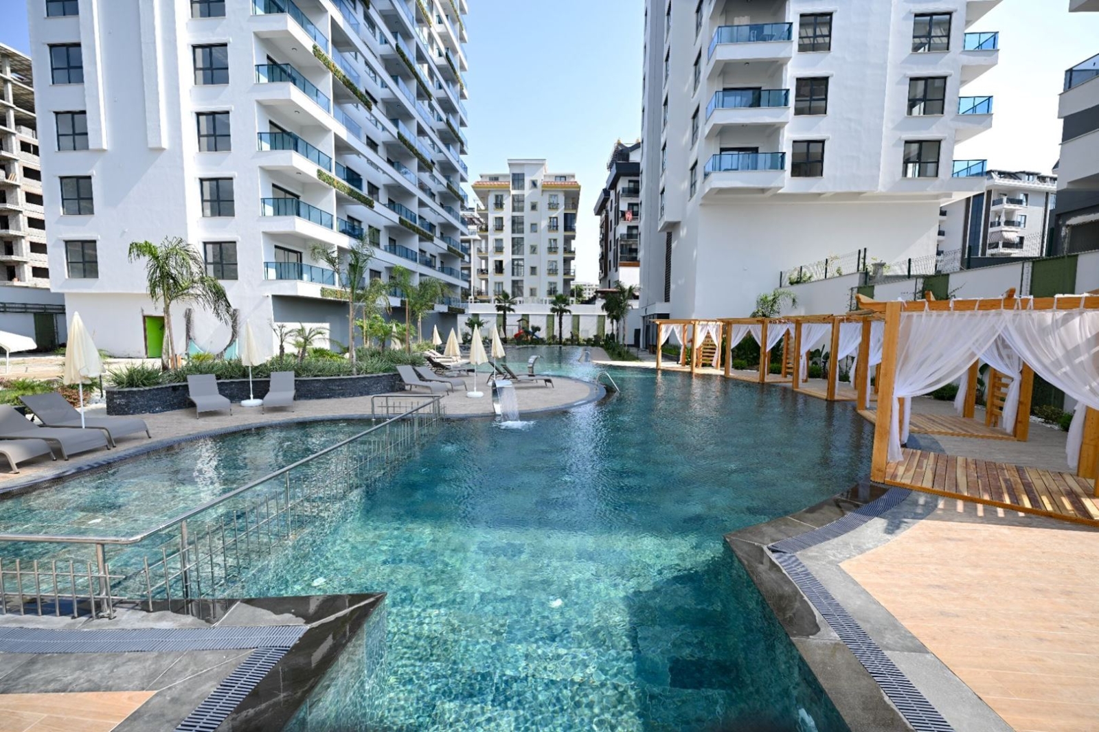 Всего 900 метров до моря и собственный оборудованный пляж с трансфером — редкое преимущество для Махмутлара.