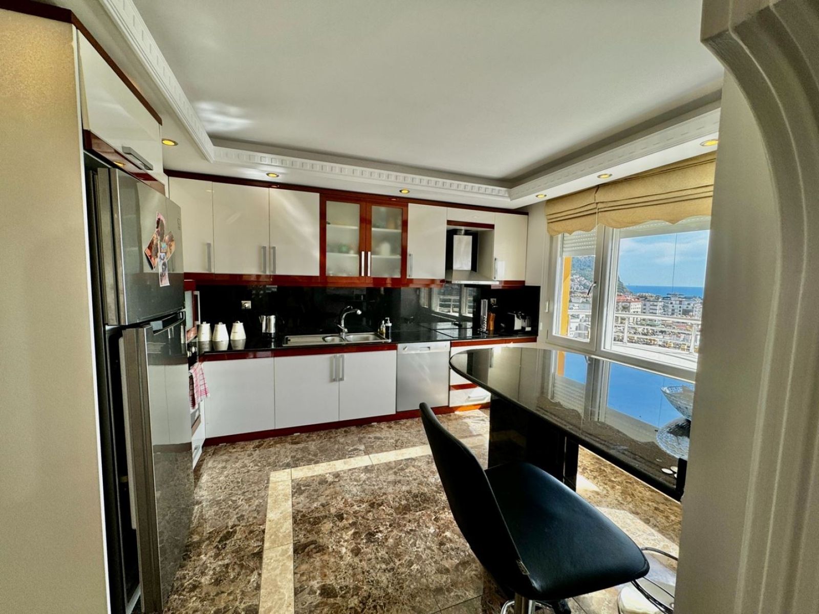 Просторная квартира 5+1 с панорамным видом на крепость и море расположена в одном из самых престижных районов Аланьи.