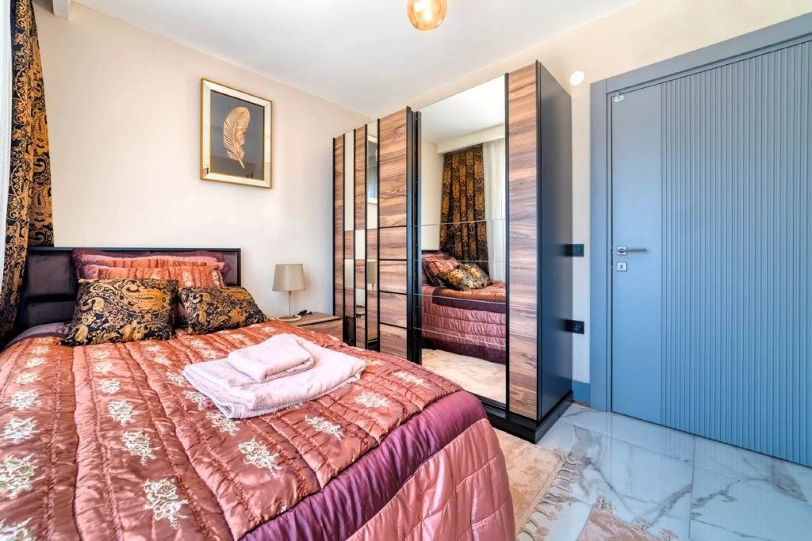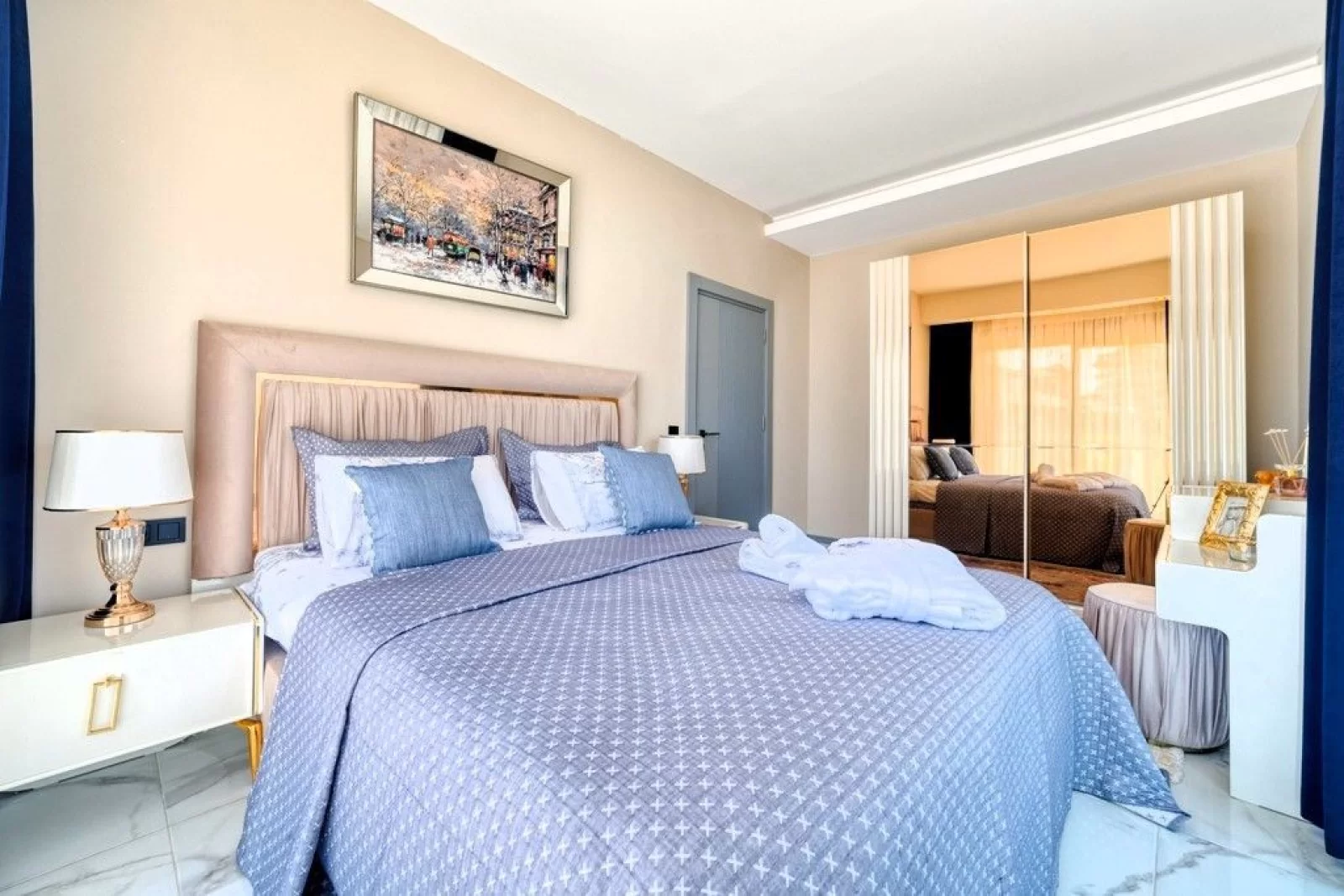 Квартира площадью 110 м² полностью меблирована новой роскошной мебелью и готова к заселению.